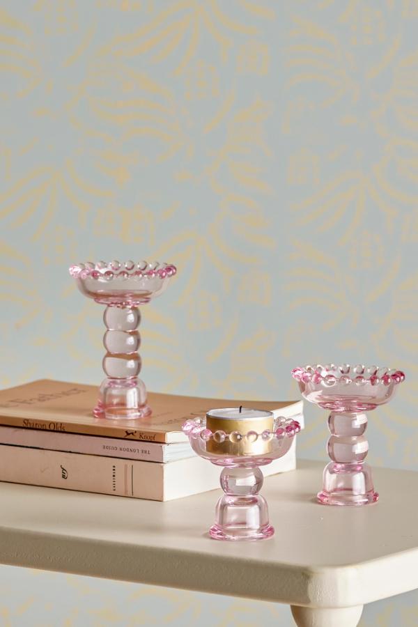 De Delphia kandelaar groot van Bloomingville is uitgevoerd in glas met een zachte roze tint en een verfijnd bubbeldesign. Het transparante materiaal zorgt voor een lichte uitstraling, terwijl de speelse structuur net dat beetje extra karakter toevoegt.